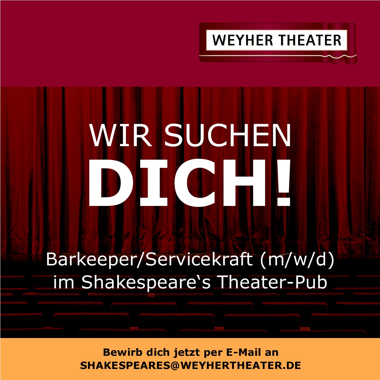Haben wir dein Interesse geweckt? Dann freuen wir uns über deine aussagekräftige Bewerbung (insbesondere Lebenslauf) unter Angabe des frühestmöglichen Eintrittstermins per Mail an shakespeares(at)weyhertheater.de.